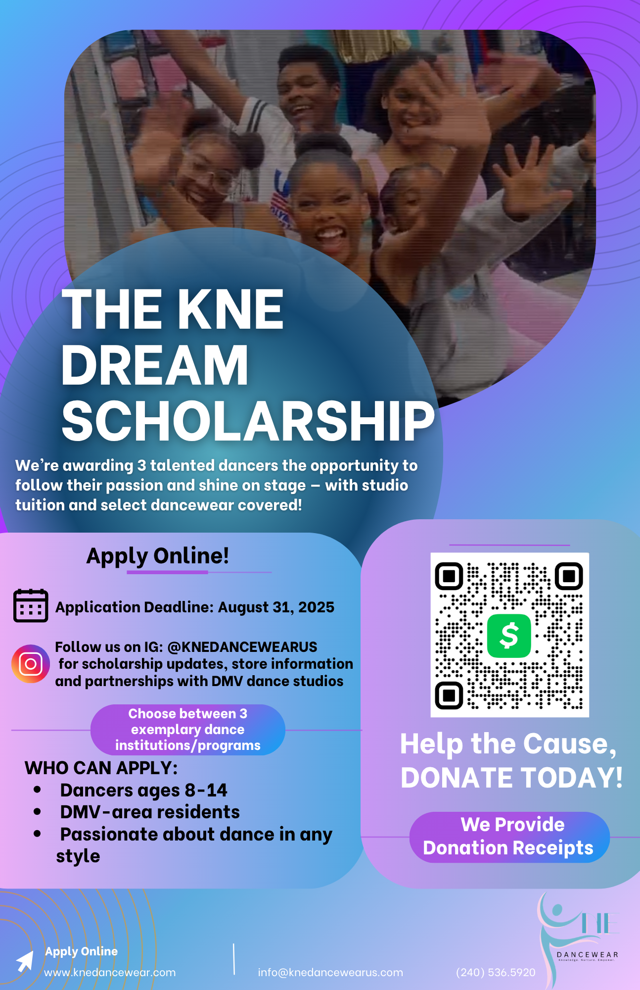 The KNE Dream Scholarship is a community-based initiative that provides full tuition and dancewear sponsorship to selected dancers for the entire 2025–2026 dance season at a partnering dance studio in the DMV area.